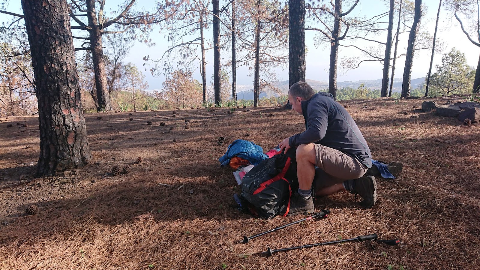 As I pack I'm considering options. I look at our guide book. We're at around 1400m. Four miles up the trail is a bus stop which can take us to Maspalomas, our intended end point at the south of the island. One mile back along the trail there are buses from Artenara down to Las Palmas. Ahead is a climb onto more exposed ground. Behind is a descent with known, mostly sheltered ground. We have one, one-person tent between us. I have a spare guy line to replace the damaged one. We could use it for two, without the inner, but it wouldn't be fun with winds like this blowing under the fly. And should we really be out in these conditions, with more height to gain and more exposure? I don't have my wind speed monitor with me, and it's hard estimating such things. It's all too easy to exaggerate. But, at best, I reckon winds through the night were around 40mph gusting to 50mph. At those speeds walking is difficult at best, dangerous at worst. My mind is made up.