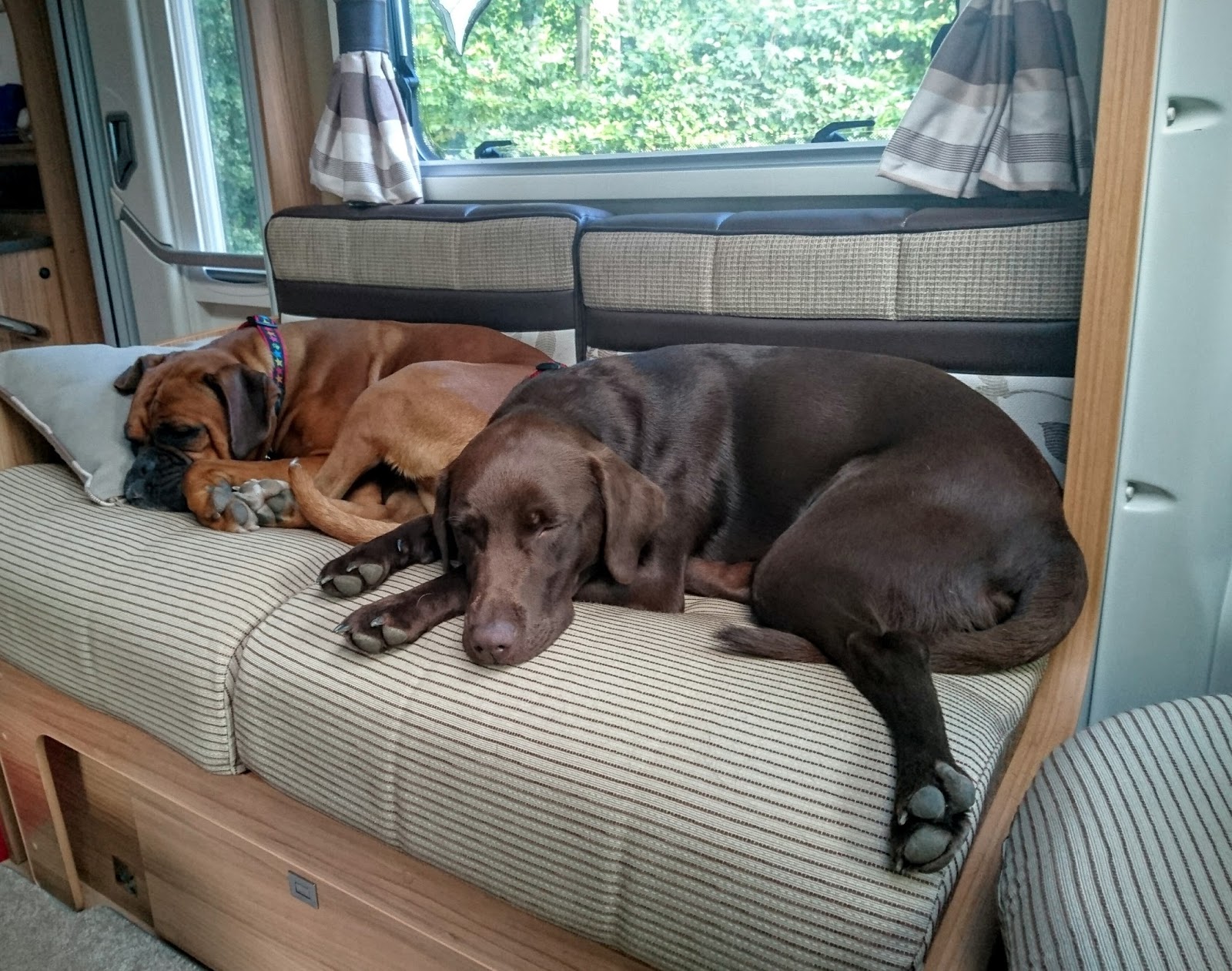 So much for the downside. What about the benefits of driving such a huge lump of a thing. Well...SPACE, pretty much sums it up. We have a comfy lounge which can seat up to six or seven folk, a separate, roomy kitchen, a washroom with a separate shower cubicle and...a permanent double bed! Making up the bed each night had become a real bugbear for me so this was a must in our upgrade. Plus, the lounge includes two, forward facing, belted passenger seats something we felt was significantly lacking in the Warwick. This means we can transport up to four people. Also, a double bed can be made up in the lounge, making this a proper four berth van (many on the market have four beds but only two passenger seats!). As you can see, the dogs think it's JUST big enough.